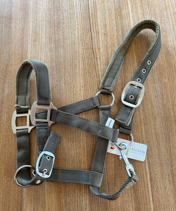 Ein mit feinem Teddyfleece weich gepolstertes Halfter für Shetlandponys mit matten Beschlägen.